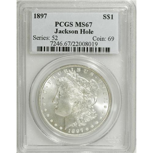 <B>1897 S$1 MS67 PCGS.</B></I> Ex: Jackson Hole. Although this date is considered common in all grades, it was once considered a rarity, and it actually remains an important condition rarity that is elusive in top quality. Superb Gem specimens are almost never encountered in the numismatic marketplace. This Superb Gem is frosty and fully brilliant with amazing silver surfaces. It is also a fully struck representative with outstanding details on the obverse and reverse. This coin is among the finest available, as no finer examples have ever been certified. Population: 15 in 67, 0 finer (2/07).<BR><I>From The Jackson Hole Collection.</B></I><BR><BR><b>Shipping:</b> Coins & Currency (<a target="_blank" href="http://www.heritageauctions.com/common/shipping.php">view shipping information</a>)