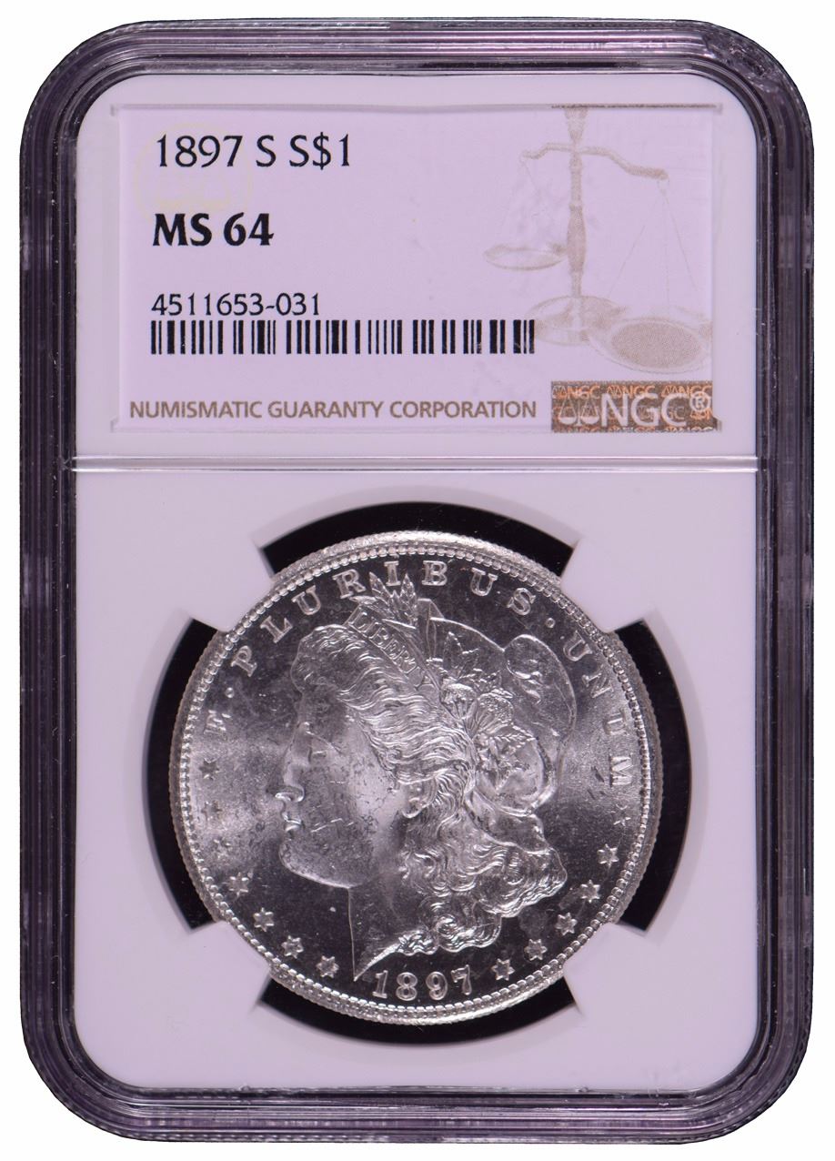One 1897-S $1 Morgan Silver Dollar Coin NGC MS64.
