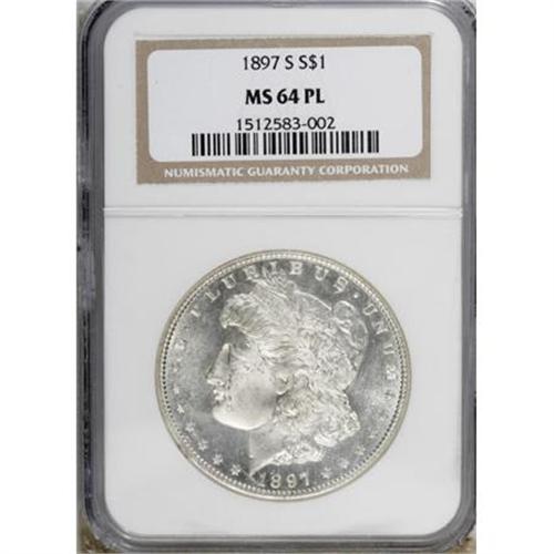 <B>1897-S $1 MS64 Prooflike NGC.</B></I> NGC Census: (233/122). PCGS Population (273/150). Numismedia Wsl. Price for NGC/PCGS coin in MS64: $160. (#7251)<BR><BR><B>Coin Engraver:</B> George T. Morgan<BR><BR><b>Shipping:</b> Coins & Currency (<a target="_blank" href="http://www.heritageauctions.com/common/shipping.php">view shipping information</a>)