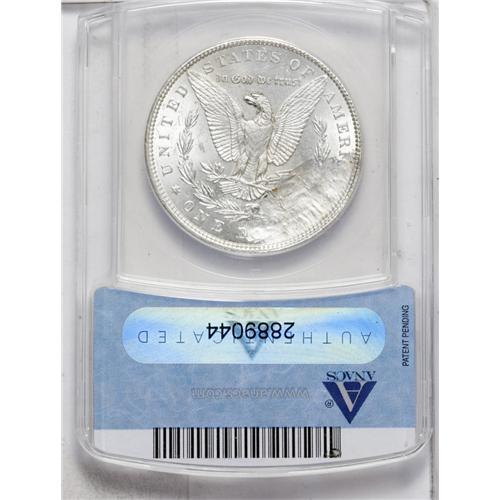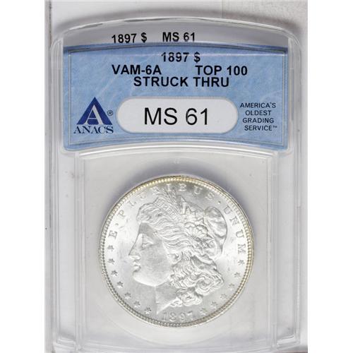<B>1897<img border='0' src='http://www.heritagecoins.com/images/star.gif' width=10 height=10>$1> Morgan Dollar--Strike-Through--MS61 ANACS.</B></I> VAM-6a. A Top 100 Variety. The "Pitted Reverse," though the obliteration of the lower right reverse by greasy debris is more obvious. Lustrous with sections of gold-green patina and a solid strike, though a fingerprint appears above the eagle.