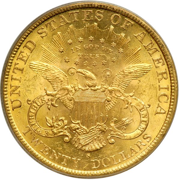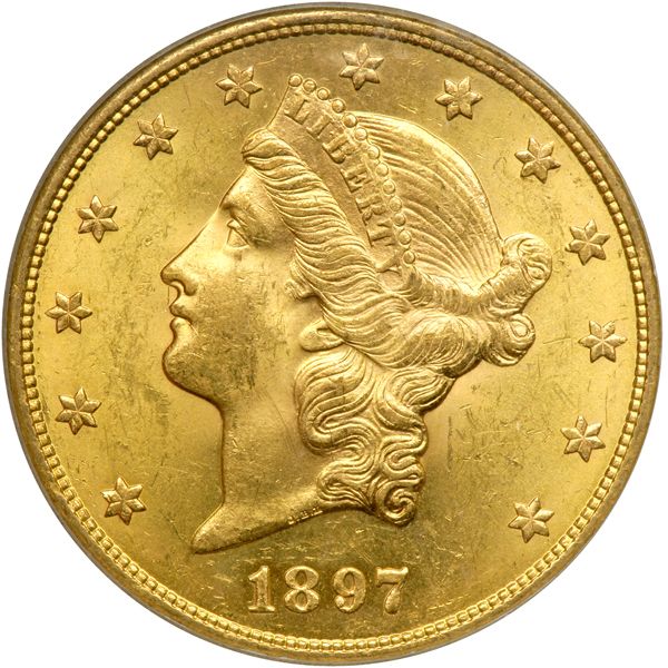 1897-S $20 Liberty. SEGS graded MS-62. The first digit of this date shows recutting on the left base.