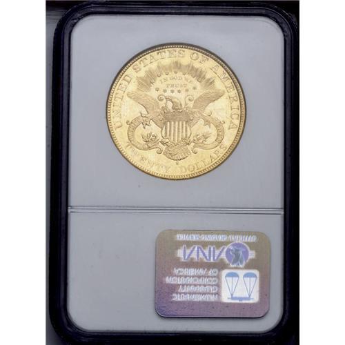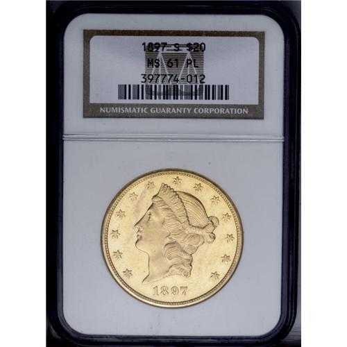 <B>1897-S<$20> MS61 Prooflike NGC.</B></I> The medium mirrors on this sharply struck, yellow-gold double eagle host the abrasions, most notably two long, thin ones in the right obverse field, that restrict the grade. Still, an elusive prooflike example of this date.<BR><I>From The New York Eye Appeal Collection.</B></I>