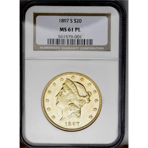 <B>1897-S<$20> MS61 Prooflike NGC.</B></I> Well struck with glassy, dark fields and a frosty, flashy appearance. A faint fingerprint fragment is noted in the left obverse field, and numerous small abrasions further limit the grade. Census: 6 in 61 Prooflike, 13 finer (7/06). <BR><BR><B>Important notice:<