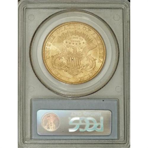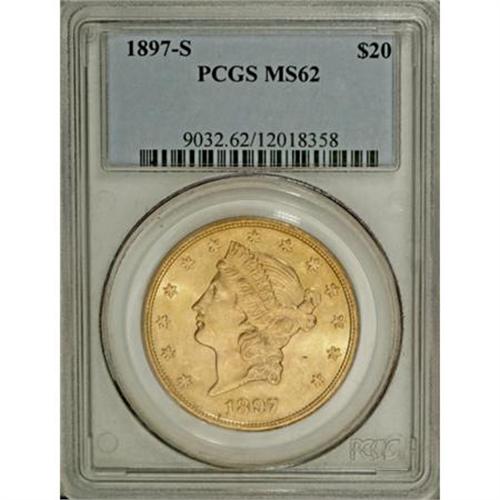 <B>1897-S $20 MS62 PCGS.</B></I> A flashy and very lustrous twenty with wheat-gold color and Liberty showcasing a very clean cheek. Just a few wispy hairlines in the lower half of the obverse keep this from a finer grade.<BR><I>From The York/Hallenbeck #2 Current Finest PCGS Registry Set of Liberty Double Eagles.</B></I><BR><BR><B>Coin Engraver:</B> James B. Longacre<BR><BR><b>Shipping:</b> Coins & Currency (<a target="_blank" href="http://www.heritageauctions.com/common/shipping.php">view shipping information</a>)