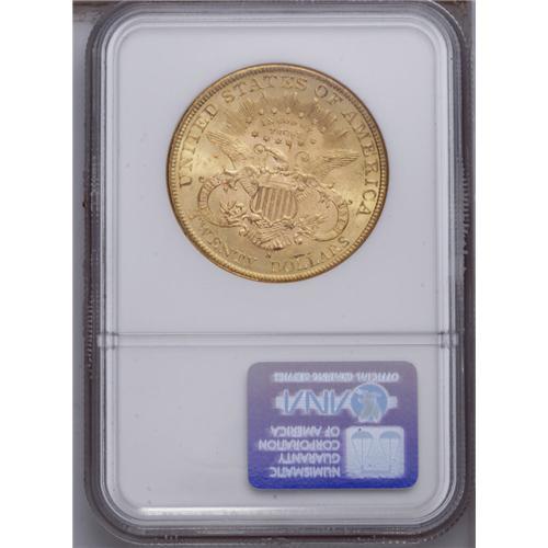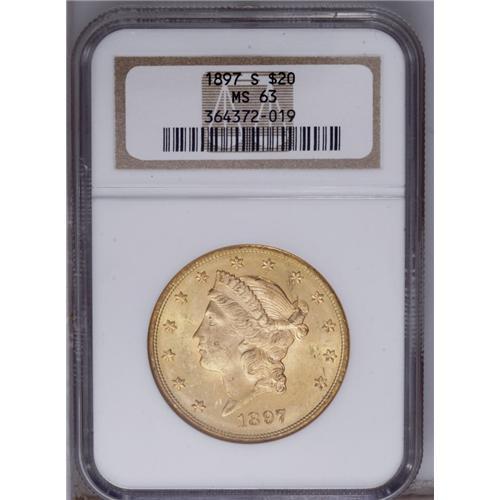 <B>1897-S $20 MS63 NGC.</B></I> Nearly unbroken luster exudes from peach-gold surfaces that are imbued with traces of lime-green. The design elements are well impressed throughout. The grade is defined by a few minute marks on Liberty's cheek and neck and in the fields.