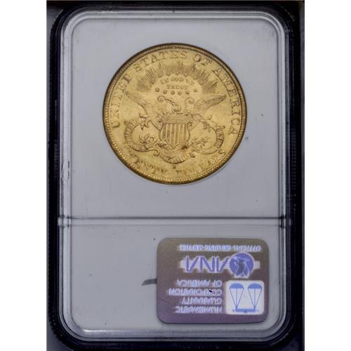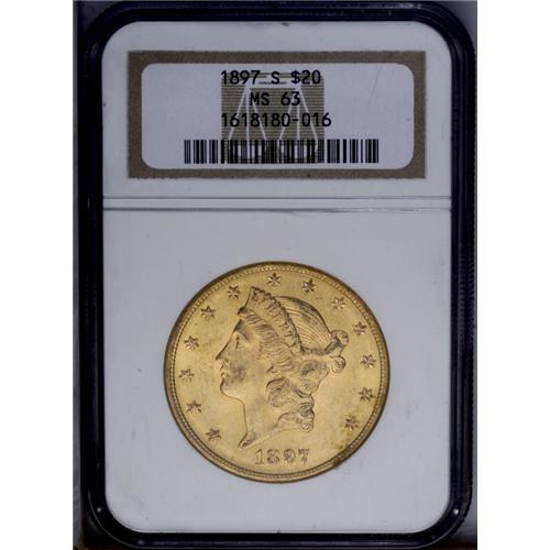 <B>1897-S<$20> MS63 NGC.</B></I> Radiant bloom enlivens the devices. Several luster grazes on Liberty's cheek and in the fields are grade-limiting. Overall, a well presented Select twenty that is not often seen at the next level. <BR><BR><B>Important notice:</B> Heritage usually auctions material at the rate of 200-250 lots per hour. On some occasions eBay Live bid software or the Internet may not be able to keep up with the pace of the auction. We recommend placing a realistic absentee bid now as insurance to avoid disappointment. Occasionally the auctioneer may eliminate or reject an eBay Live bid, and the auctioneer may also reopen a lot after the close of the eBay live bidding (usually because we missed an audience bid), and may reject your bid even if it shows you as the winning bidder. By bidding via eBay Live, you agree that Heritage may award the lot to another bidder at its sole discretion under the circumstances described above or any other reasonable circumstances. Since eBay bids are not shown to us until we open the lot on the floor, we treat those bids just like floor bids. In most cases the floor responds before the eBay bid is presented to us, due to Internet lag time, so for consistency we have made it a policy that floor bids are always considered first over tie eBay live bids. Also please note that all Heritage lots purchased through eBay Live carry a 20% Buyer's Premium. Please make sure you read the Terms and Conditions before you bid. This lot is being auctioned in conjunction with a live floor auction by Heritage Galleries & Auctioneers. All final auction and invoice information will be supplied by Heritage Galleries & Auctioneers, and all other information should be considered preliminary. Lot:4376 <BR><BR><B>Winning Notification and Billing:</B> After the FINAL session in this auction is complete, Heritage will send e-mail and snail mail invoices. This process normally takes several days. All final auction and invoice information will be supplied by Heritage Galleries & Auctioneers, and all other information should be considered preliminary. <BR><BR>This auction will be conducted on a live auction floor and over the Internet through eBay Live. If you choose to place an absentee bid, please take a moment to <font color='#0000ff'><u><a href='http://pages.ebay.com/liveauctions/help/before/laabsentee.html'>learn how eBay Live absentee bidding works</a></u></font><font color='#000000'>
