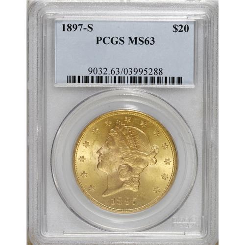 <B>1897-S $20 MS63 PCGS.</B></I> This double eagle is lovely for the designated grade, since the lustrous green-gold surfaces are surprisingly free from the scuffs that tend to frequent this bag-stored type.<BR><BR><b>Shipping:</b> Coins & Currency (<a target="_blank" href="http://www.heritageauctions.com/common/shipping.php">view shipping information</a>)