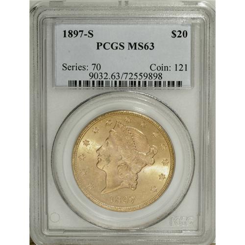 <B>1897-S $20 MS63 PCGS.</B></I> Yellow-gold surfaces with tints of light tan are awash in luster, and exhibit nicely struck design elements. A few minute obverse bagmarks preclude a higher grade.<BR><BR><b>Shipping:</b> Coin/Currency (<a target="_blank" href="http://www.heritageauctions.com/common/shipping.php">view shipping information</a>)