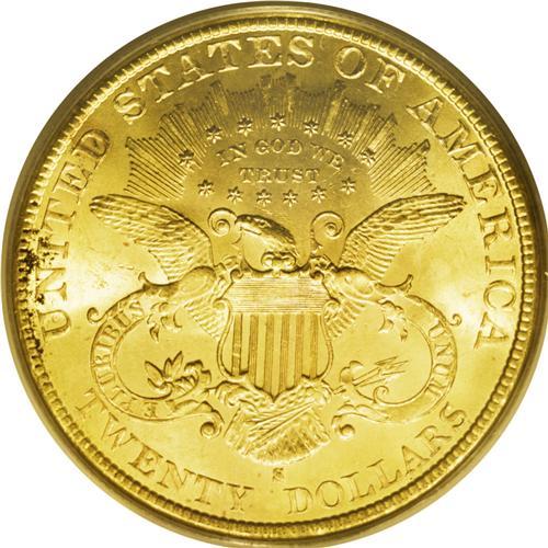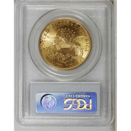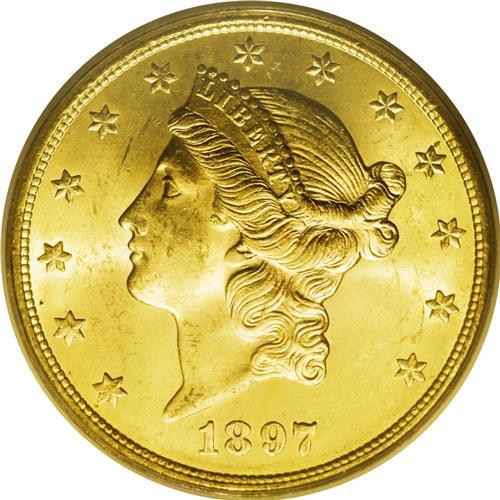 <B>1897-S<$20> MS64 PCGS.</B></I> A delightfully appealing example of this fairly available issue, one that was largely produced from gold mined from the Klondike in Alaska. Although "available," most Uncirculated examples are MS62 or below. The present near-Gem offers lustrous orange-gold centers with a bit of smoke-gray in the outer fields, minimal abrasions, a strong strike, and overall good eye appeal. PCGS has graded only four pieces finer (9/06).