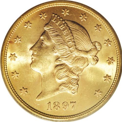 <B>1897-S $20 MS64 PCGS.</B></I> A charming example, this lustrous double eagle has bright yellow and orange-gold luster with satiny surfaces. The strike is bold despite the usual slight merging of detail within the folds of Liberty's hair. Although not particularly rare in near-Gem grade, PCGS has certified just five finer pieces (4/07).<BR><BR><b>Shipping:</b> Coins & Currency (<a target="_blank" href="http://www.heritageauctions.com/common/shipping.php">view shipping information</a>)