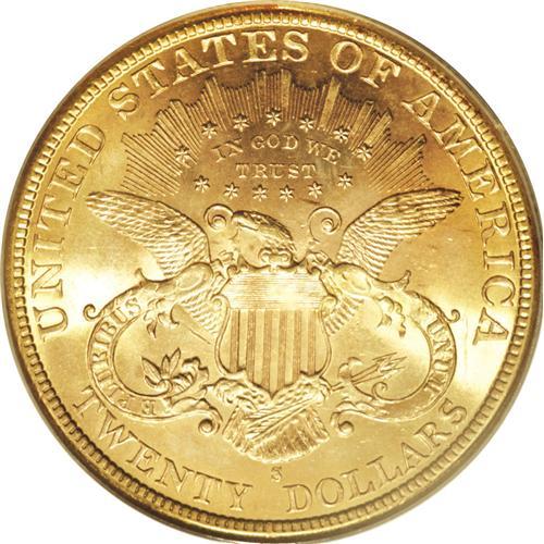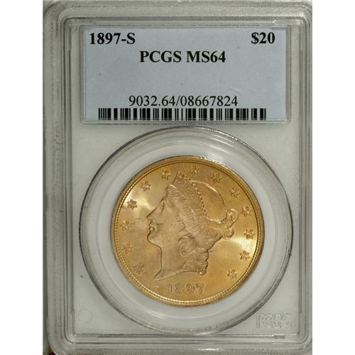 1897-S $20 MS64 PCGS. A remarkable example, this lustr