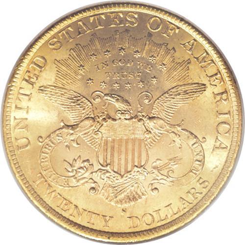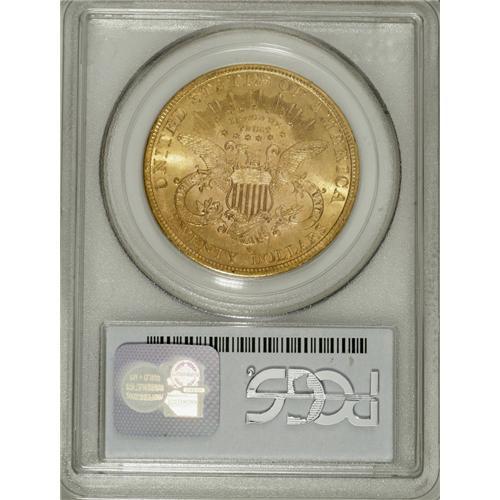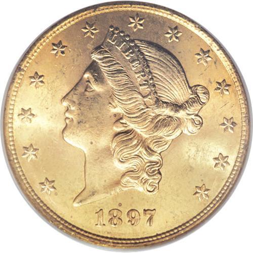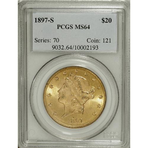 <B>1897-S $20 MS64 PCGS.</B></I> Booming luster and luminous olive and apricot toning affirm the eye appeal of this expertly struck near-Gem. The fields are well preserved, and the cheek has only faint contact. The annual twenty dollar mintage contest between Philadelphia and San Francisco was closer than usual in 1897, since Philadelphia came within 90,000 pieces of the S-mint production. PCGS has certified a mere four pieces finer (2/07).<BR><BR><b>Shipping:</b> Coins & Currency (<a target="_blank" href="http://www.heritageauctions.com/common/shipping.php">view shipping information</a>)