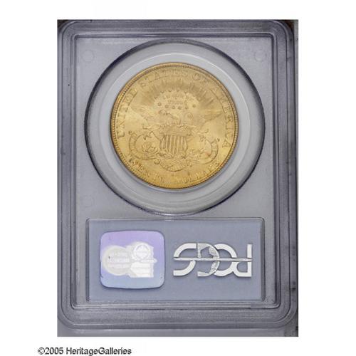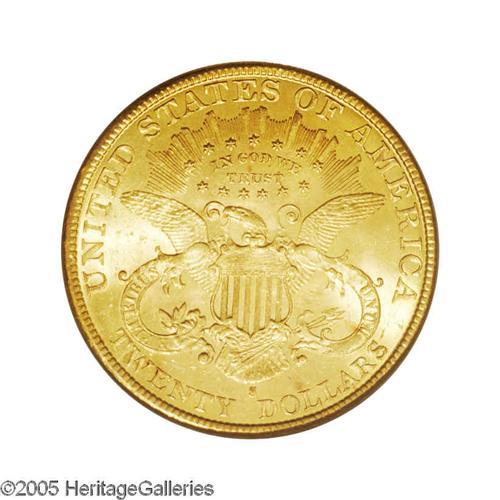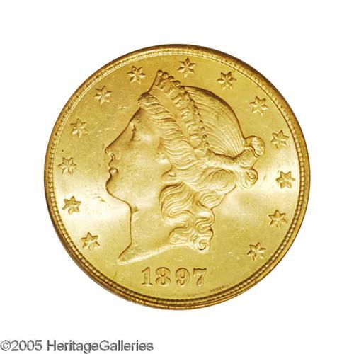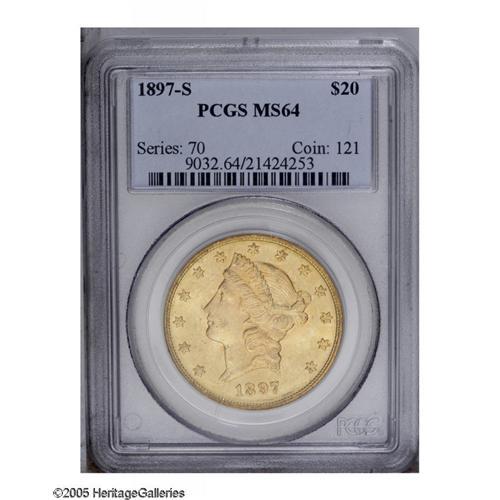 <B>1897-S<$20> MS64 PCGS.</B></I> Brilliant and lustrous with excellent eye appeal. This is a sharply struck Near-Gem with light yellow gold color on the obverse, slightly deeper gold on the reverse. Only a few scattered abrasions and tiny copper toning spots are visible on either side. Population: 216 in 64, 3 finer (12/05).