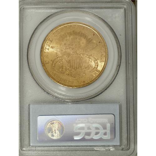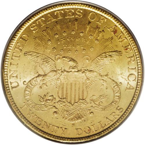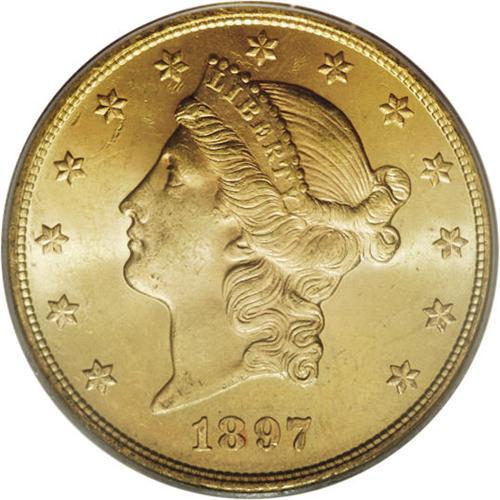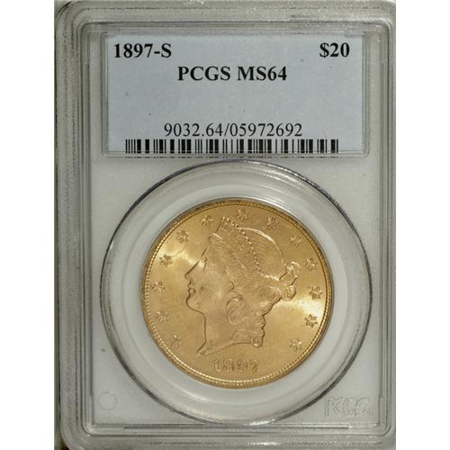 <B>1897-S $20 MS64 PCGS.</B></I> Here is another condition rarity in the Liberty double eagle series, as evidenced by the PCGS population data that indicate only five finer examples have been certified by that service (4/07). The surfaces have a few trivial abrasions on each side, entirely consistent with the grade but preventing a higher grade. This piece is fully brilliant with frosty yellow-gold luster.<BR><BR><b>Shipping:</b> Coins & Currency (<a target="_blank" href="http://www.heritageauctions.com/common/shipping.php">view shipping information</a>)