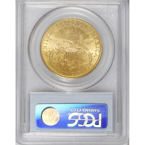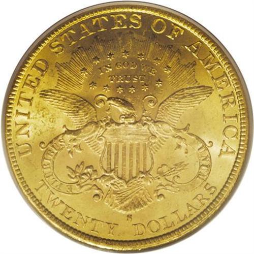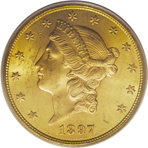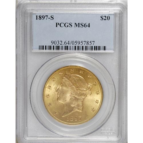 <B>1897-S $20 MS64 PCGS.</B></I> The 1897-S twenty dollar is found in fairly large numbers in grades below MS63. Near-Gems are available with patience and a little searching, and higher-graded pieces are relatively far and few between. Additionally, as Jeff Garrett and Ron Guth say: "As with most Liberty Head double eagles, the surfaces of most coins seen are heavily abraded." The near-Gem presented in this lot is certainly an exception to this assertion. There are a few light marks and luster grazes to preclude full Gem status, but the lustrous yellow-gold surfaces laced with subtle hints of mint-green are essentially well preserved. The design elements are exceptionally well struck.<BR><BR><b>Shipping:</b> Coins & Currency (<a target="_blank" href="http://www.heritageauctions.com/common/shipping.php">view shipping information</a>)
