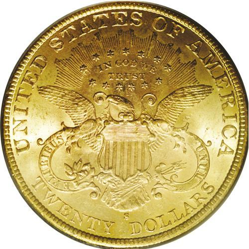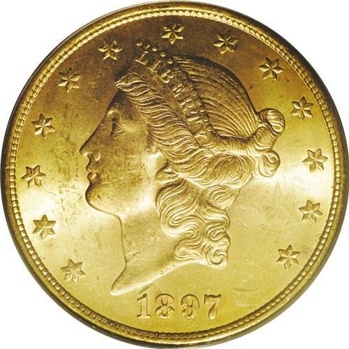 <B>1897-S<$20> MS64 PCGS.</B></I> Typically well defined with an attractive coating of reddish patina over minimally abraded surfaces. Precious few Gems survive of this issue, so an attractive MS64 is about as nice as a collector can realistically expect.