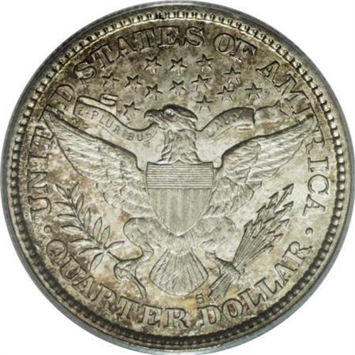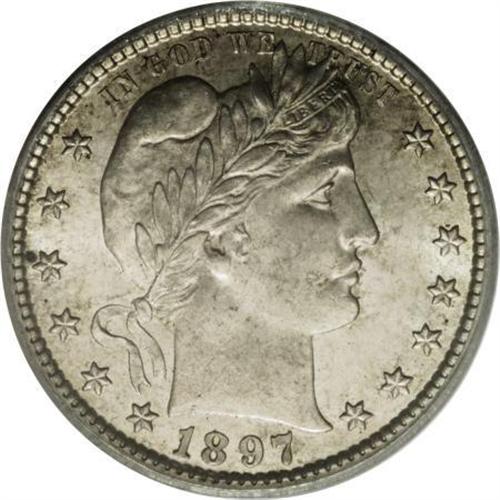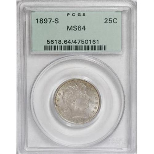 <B>1897-S 25C MS64 PCGS.</B></I> Apple-green and golden-brown invigorate the borders, while the fields and devices are predominantly pearl-gray. Intricately struck, and refreshingly clean for the grade. A small obverse spot is noted near 9 o'clock. Encased in a green label holder. Population: 15 in 64, 14 finer (4/07).<BR><I>From The Belle Glade Collection, Part Two.</B></I><BR><BR><B>Coin Engraver:</B> Charles E. Barber<BR><BR><b>Shipping:</b> Coins & Currency (<a target="_blank" href="http://www.heritageauctions.com/common/shipping.php">view shipping information</a>\)