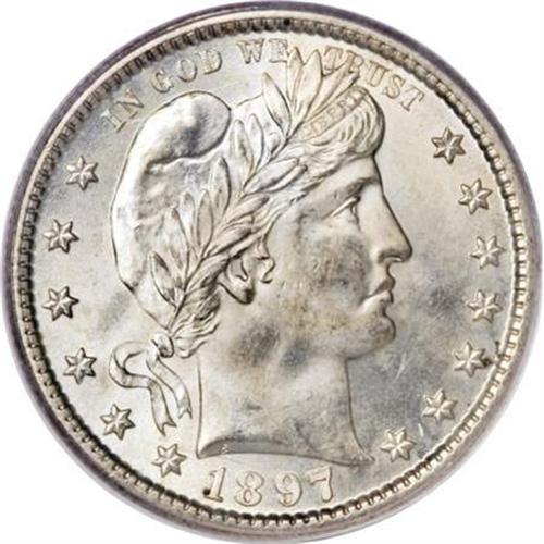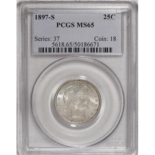 <B>1897-S 25C MS65 PCGS.</B></I> The low mintage of 542,229 pieces implies the rarity, and nice Mint State examples are popular when they appear--seldom--in the numismatic marketplace. This lovely Gem offers brilliant luster radiating from gold-tinged, silvery surfaces that appear remarkably clean under a loupe. Tiny die cracks are noted at both the top and bottom obverse. PCGS has certified only four coins finer (1/08).<BR><I>From The Southwest Collection.</B></I><BR><BR><B>Coin Engraver:</B> Charles E. Barber<BR><BR><b>Shipping:</b> Coins & Currency (<a target="_blank" href="http://www.heritageauctions.com/common/shipping.php">view shipping information</a>)