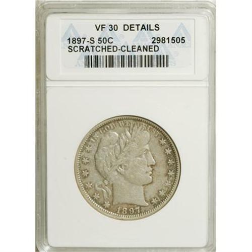 <B>1897-S 50C --Cleaned, Scratched--ANACS. VF30 Details.</B></I> NGC Census: (2/53). PCGS Population (4/68). Mintage: 933,900. Numismedia Wsl. Price for NGC/PCGS coin in VF30: $507. (#6479)<BR><BR><b>Shipping:</b> Coins & Currency (<a target="_blank" href="http://www.heritageauctions.com/common/shipping.php">view shipping information</a>)
