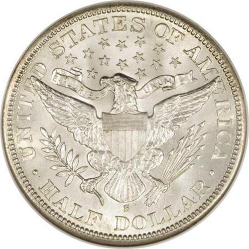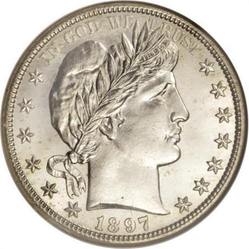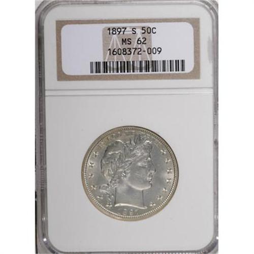 <B>1897-S 50C MS62 NGC.</B></I> Bright luster exudes from both sides of this S-mint half dollar that exhibits nicely defined design elements, except for the usual softness in the upper right corner of the shield. Speckles of light tan color gravitate to the peripheries, more noticeable on the obverse. A combination of planchet striations and slide marks on Liberty's cheek likely accounts for the limited grade.<BR><BR><B>Coin Engraver:</B> Charles E. Barber<BR><BR><b>Shipping:</b> Coins & Currency (<a target="_blank" href="http://www.heritageauctions.com/common/shipping.php">view shipping information</a>)