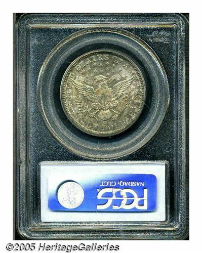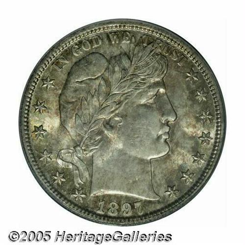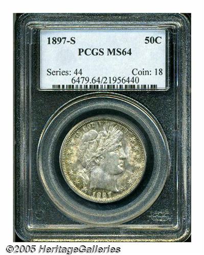 <B>1897-S<50C> MS64 PCGS.</B></I> A well documented scarcity among early Barber Half Dollars, one that commands a generous premium even in heavily worn condition. This lustrous example is draped in mottled apricot-gold toning and, like most of its kind, displays excellent sharpness throughout. Population: 14 in 64, 13 finer (4/05).