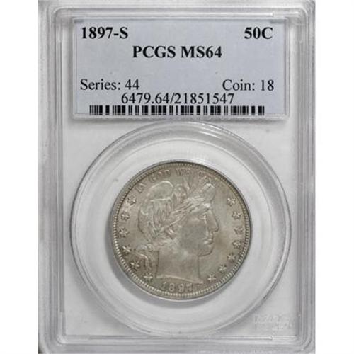 <B>1897-S 50C MS64 PCGS.</B></I> This attractive gray-silver coin features a pleasing satin luster and metallic effect that provides plenty of eye appeal to the collector. Noteworthy marks are difficult to find; indeed, unusually so for the grade. A better date coin that is likely headed to an outstanding date collection of Barber halves. Population: 15 in 64, 14 finer (3/08).<BR><BR><B>Coin Engraver:</B> Charles E. Barber<BR><BR><b>Shipping:</b> Coins & Currency (<a target="_blank" href="http://www.heritageauctions.com/common/shipping.php">view shipping information</a>)