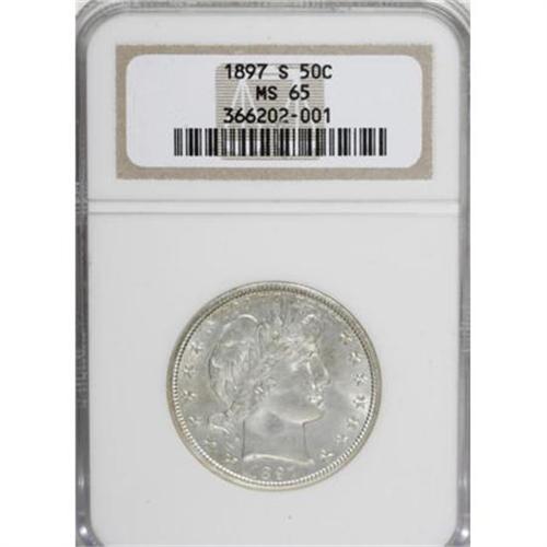 <B>1897-S 50C MS65 NGC.</B></I> The silvery surfaces lightly dusted with gold patina are fairly prooflike, especially on the reverse. The effect on the obverse is dampened by some light powder-gray coloration in the fields. Marvelous cartwheel luster emanates from both sides, and the overall eye appeal is exemplary. A memorable example, worthy of acquisition, of this key-date issue. Census: 7 in 65, 6 finer (1/08).<BR><I>From The Southwest Collection.</B></I><BR><BR><B>Coin Engraver:</B> Charles E. Barber<BR><BR><b>Shipping:</b> Coins & Currency (<a target="_blank" href="http://www.heritageauctions.com/common/shipping.php">view shipping information</a>)