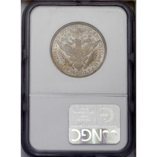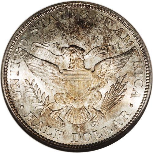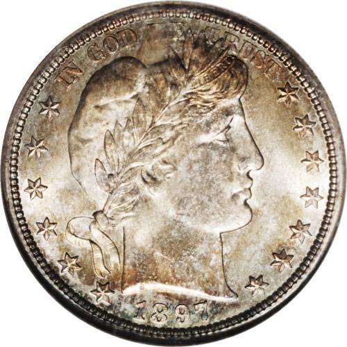 <B>1897-S<50C> MS67 NGC.</B></I> The '97-S is an important semi-key in the Barber half dollar series. Fewer than one million pieces were struck, and relatively few Mint State coins are known. NGC and PCGS currently have seen less than 80 examples in Uncirculated condition, and only 25 of these are Gem or better specimens. In MS67, the state of preservation of the present coin, only five examples have been certified, along with one finer.<BR> The coin in this lot shows radiant luster and sharply delineated design features. The only hint of softness is seen in the upper right (facing) corner of the shield and adjacent wing feathers. Variegated pastels of gold and powder-blue patination bathe impeccably preserved surfaces. Some barely discernible handling marks on Liberty's cheek and neck are mentioned for accuracy. Census: 2 in 67, 1 finer (1/06).