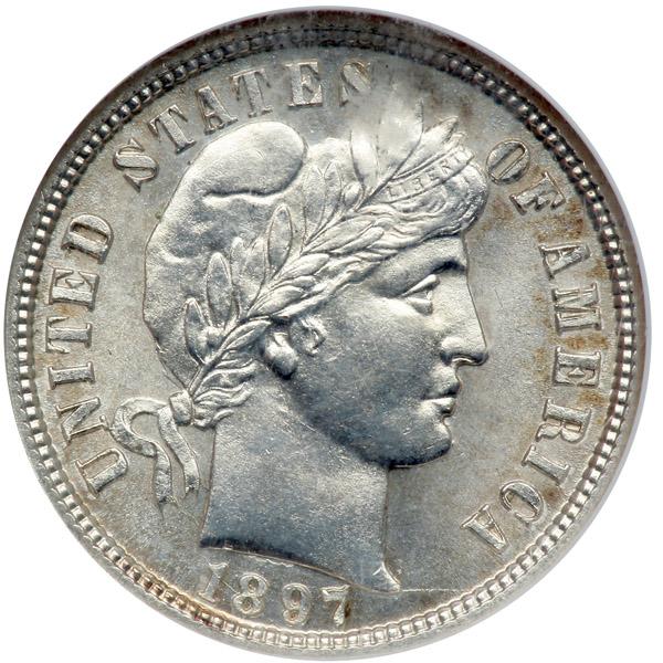 1897-S. NGC graded MS-64. Well struck and white. The numismatic world is peopled by many classes of collectors, but the most keenly attuned will always recognize a scarce coin in very choice quality, and this handsome Barber dime is certainly no slacker. When it comes to rarity, the low grading census points to how few of them survive. When it comes to frosted luster and overall eye-appeal, few MS64 dimes from this branch Mint can compare. Pop 16; 6 in 65, 1 in 66, 1 in 67.