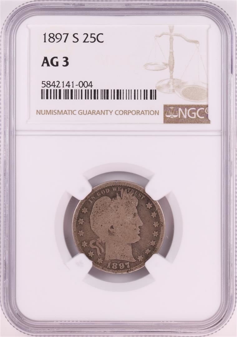 One 1897-S Barber Quarter Coin NGC AG3. NGC Certified.