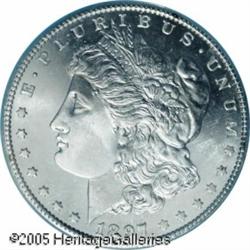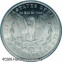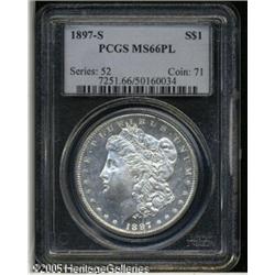<B>1897-S<img border='0' src='http://www.heritagecoins.com/images/star.gif' width=10 height=10>$1 MS66 Prooflike PCGS.</B></I> Almost certainly not a Redfield coin, this piece lacks any of the characteristic bagginess commonly seen on the coins from that hoard. The surfaces overall are exquisite with flashy, mirrored fields and moderately frosted devices. Nearly abrasion-free, a hint of milky patina is seen in the right obverse field of this otherwise fully brilliant example. Easily one of the finest '97-S Prooflike dollars we have seen. Population: 19 in 66 Prooflike, 2 finer (1/05). Lot:10518