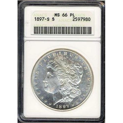 <b>1897-S Morgan Dollar. ANACS graded MS66 PL.</b> Resplendent surfaces that are thoroughly original and glowing, with keen-edged, prooflike silver luster. We see that a generous amount of crisp detail also shows for the type, including the areas where weak metal flows usually failed to make it into the deepest channels of the dies, leaving the centers weak. This coin is very bold, by comparison, and epitomizes the 1897-S issue in Gem quality <b>(PCGS # 7251)</b>