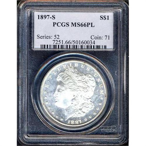 <b>1897-S Morgan Dollar. PCGS graded MS66 PL.</b> Highly lustrous with the shimmering mint quality S-mint coinage is so well known for; also, this beautiful prooflike '97-S is struck with scientific exactness throughout the hair and cap, the wings, chest and legs of the eagle. A desirable gem <b>(PCGS # 7251)</b>