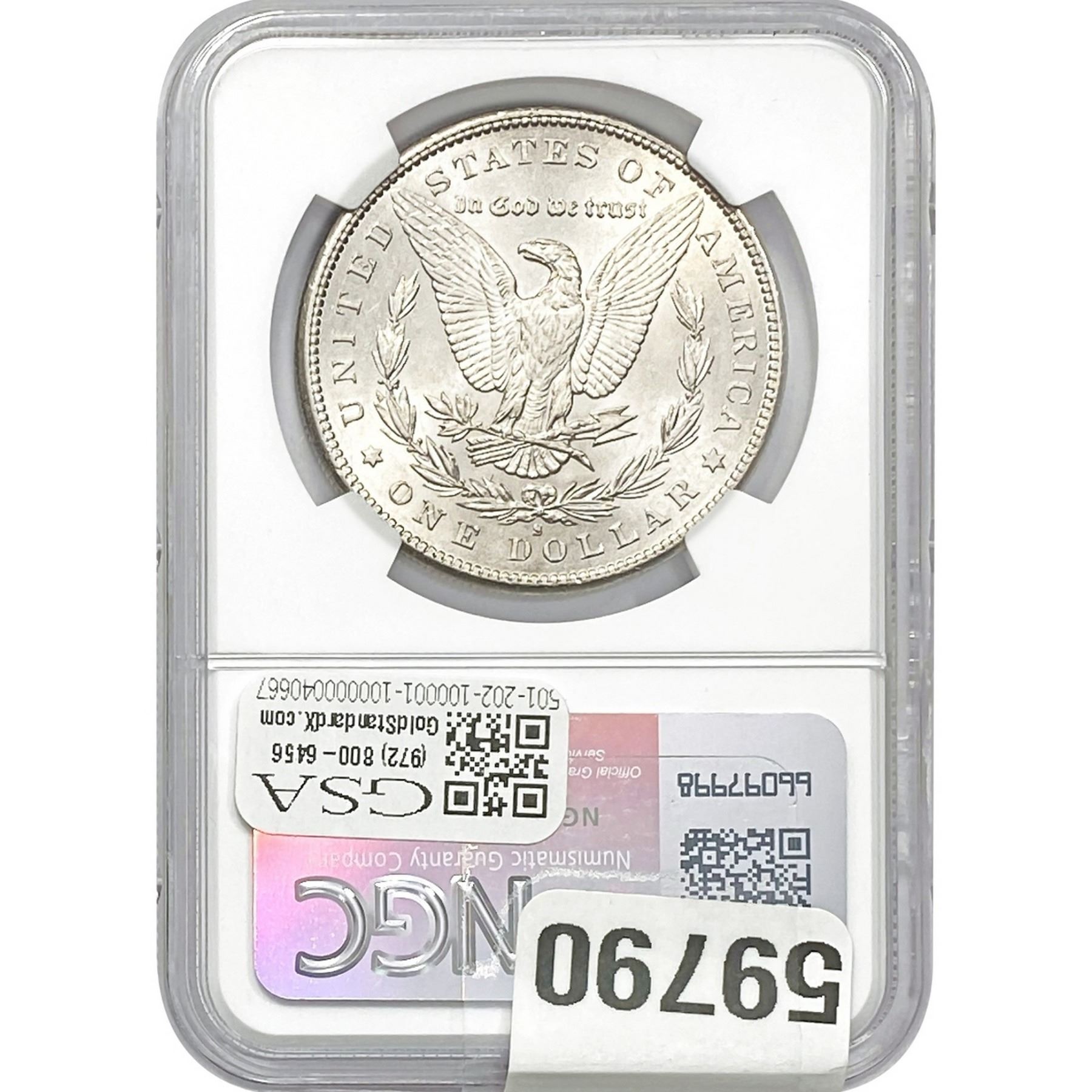 e. Coins sold referencing a third-party grading service are sold “AS IS” without any express or implied warranty, except for a guarantee by GSA that they are genuine. Removal or alteration of the holder, voids all of Bidder’s claims concerning that Product. Certain warranties may be available from the grading services and Bidders are referred to them for further details: Numismatic Guaranty Corporation (NGC), PO Box 4776, Sarasota, FL 34230, www.ngccoin.com/services/writtenguarantee.asp; Professional Coin Grading Services (PCGS), PO Box 9458, Newport Beach, CA 92658, www.pcgs.com/guarantee.html; ANACS, 6555 S. Kenton St., Ste. 303, Englewood, CO 80111; and Independent Coin Grading Co. (ICG), 7901 East Bellview, Ave., Suite 50, Englewood, CO 80111.