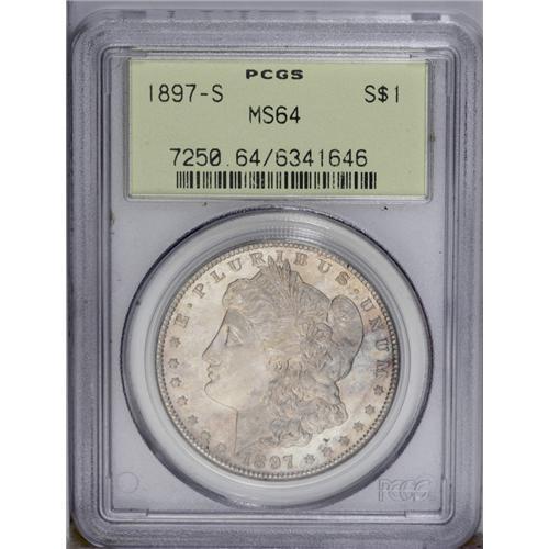 <B>1897-S<img border='0' src='http://www.heritagecoins.com/images/star.gif' width=10 height=10>$1> MS64 PCGS.</B></I> This example resides in an older green-label holder, and should be reexamined by PCGS as the surfaces are fully prooflike. Sharply struck with hazy iridescent toning across both sides, masking the cameo contrast that remains present.<BR><I>From The David L. Goodwin Collection.</B></I> <BR><BR><B>Important notice:</B> Heritage usually auctions material at the rate of 200-250 lots per hour. On some occasions eBay Live bid software or the Internet may not be able to keep up with the pace of the auction. We recommend placing a realistic absentee bid now as insurance to avoid disappointment. Occasionally the auctioneer may eliminate or reject an eBay Live bid, and the auctioneer may also reopen a lot after the close of the eBay live bidding (usually because we missed an audience bid), and may reject your bid even if it shows you as the winning bidder. By bidding via eBay Live, you agree that Heritage may award the lot to another bidder at its sole discretion under the circumstances described above or any other reasonable circumstances. Since eBay bids are not shown to us until we open the lot on the floor, we treat those bids just like floor bids. In most cases the floor responds before the eBay bid is presented to us, due to Internet lag time, so for consistency we have made it a policy that floor bids are always considered first over tie eBay live bids. Also please note that all Heritage lots purchased through eBay Live carry a 20% Buyer's Premium. Please make sure you read the Terms and Conditions before you bid. This lot is being auctioned in conjunction with a live floor auction by Heritage Galleries & Auctioneers. All final auction and invoice information will be supplied by Heritage Galleries & Auctioneers, and all other information should be considered preliminary. Lot:3714 <BR><BR><B>Winning Notification and Billing:</B> After the FINAL session in this auction is complete, Heritage will send e-mail and snail mail invoices. This process normally takes several days. All final auction and invoice information will be supplied by Heritage Galleries & Auctioneers, and all other information should be considered preliminary. <BR><BR>This auction will be conducted on a live auction floor and over the Internet through eBay Live. If you choose to place an absentee bid, please take a moment to <font color='#0000ff'><u><a href='http://pages.ebay.com/liveauctions/help/before/laabsentee.html'>learn how eBay Live absentee bidding works</a></u></font><font color='#000000'>