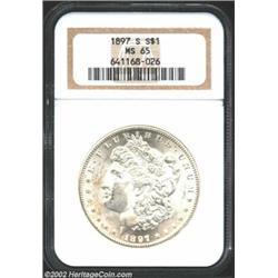 1897-S S$1 MS65 NGC. The 1 in the date is lightly doubled below the serif. The splashes of pale golden-brown patina are especially evident on the left half of the coin. A lustrous and sharply struck Gem that has virtually pristine fields. Important notice: We expect to be auctioning lots at the rate of 200-250 per hour. Sometimes eBay Premier live bid software cannot keep up with that pace, so we strongly recommend that you place a realistic proxy bid now as insurance to avoid disappointment. Also please note that all Heritage/CAA lots purchased through eBay Premier carry a 20% Buyer's Premium. Please make sure you read the Terms and Conditions.