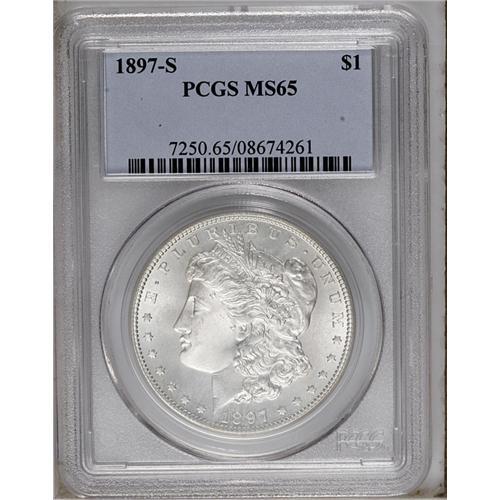 <B>1897-S<img border='0' src='http://www.heritagecoins.com/images/star.gif' width=10 height=10>$1> MS65 PCGS.</B></I> Fully brilliant and displaying a bare minimum of surface blemishes, unusual for this popular Redfield date.