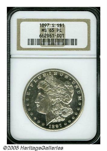 <B>1897-S<S$1> MS65 Prooflike NGC.</B></I> The highly reflective fields set off the devices on this attractive S-mint Morgan. The surfaces reveal just a slight bit of toning, and are minimally abraded.