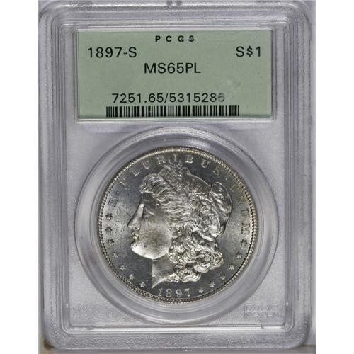 <B>1897-S<img border='0' src='http://www.heritagecoins.com/images/star.gif' width=10 height=10>$1> MS65 Prooflike PCGS.</B></I> Lightly frosted devices, flashy fields, and an intricate strike provide substantial eye appeal. Splendidly clean surfaces ensure the quality. This brilliant Gem is housed in a green label holder.