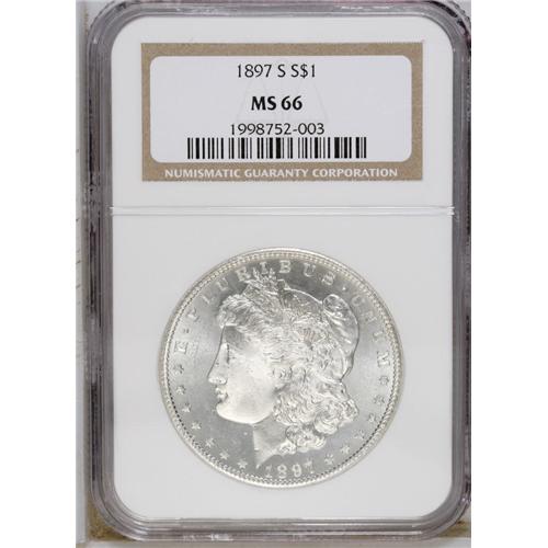 <B>1897-S S$1 MS66 NGC.</B></I> Sparkling luster dances about virtually white, silver surfaces. The design elements are powerfully impressed, and yield nice contrast with partially prooflike fields. A few minor luster grazes preclude an even higher grade. NGC has seen only 11 pieces finer.<BR><BR><b>Shipping:</b> Coin/Currency (<a target="_blank" href="http://www.heritageauctions.com/common/shipping.php">view shipping information</a>)