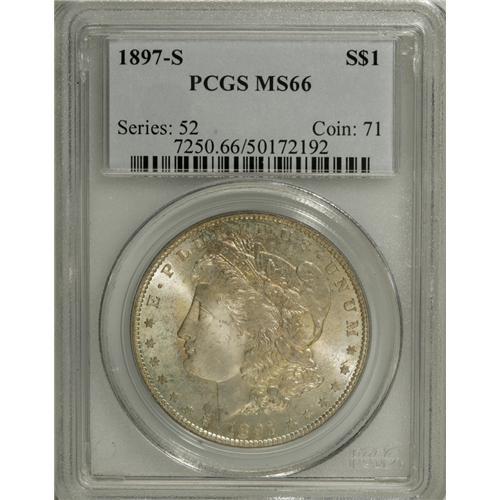 <B>1897-S S$1 MS66 PCGS.</B></I> A well struck and highly lustrous Gem that has pronounced blushes of apricot and pale blue patina. The fields are essentially pristine, and the eye appeal is nearly unimprovable.<BR><BR><b>Shipping:</b> Coins & Currency (<a target="_blank" href="http://www.heritageauctions.com/common/shipping.php">view shipping information</a>)