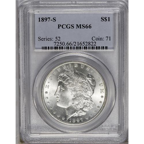 <B>1897-S<img border='0' src='http://www.heritagecoins.com/images/star.gif' width=10 height=10>$1> MS66 PCGS.</B></I> Attractive luster and a generally good strike, though slight flatness appears on the hair and stars. A brilliant and untoned Morgan with excellent eye appeal.<BR><I>From The Chicago-Ark Collection.</B></I>
