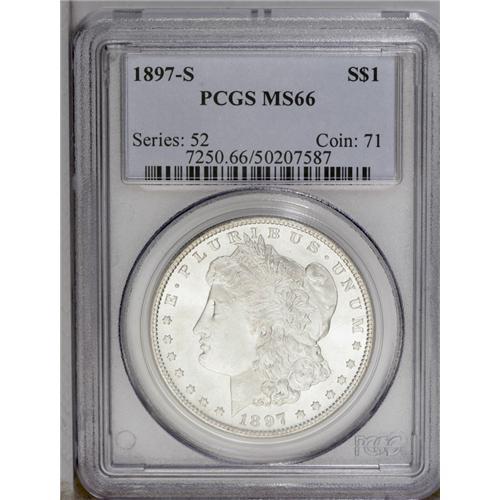 <B>1897-S<img border='0' src='http://www.heritagecoins.com/images/star.gif' width=10 height=10>$1> MS66 PCGS.</B></I> Bright luster endows each side of this well-impressed S-mint dollar. Pleasingly smooth surfaces display whispers of faint tan-gray color Population: 183 in 66, 24 finer (3/06). <BR><BR><B>Important notice:</B> Heritage usually auctions material at the rate of 200-250 lots per hour. On some occasions eBay Live bid software or the Internet may not be able to keep up with the pace of the auction. We recommend placing a realistic absentee bid now as insurance to avoid disappointment. Occasionally the auctioneer may eliminate or reject an eBay Live bid, and the auctioneer may also reopen a lot after the close of the eBay live bidding (usually because we missed an audience bid), and may reject your bid even if it shows you as the winning bidder. By bidding via eBay Live, you agree that Heritage may award the lot to another bidder at its sole discretion under the circumstances described above or any other reasonable circumstances. Since eBay bids are not shown to us until we open the lot on the floor, we treat those bids just like floor bids. In most cases the floor responds before the eBay bid is presented to us, due to Internet lag time, so for consistency we have made it a policy that floor bids are always considered first over tie eBay live bids. Also please note that all Heritage lots purchased through eBay Live carry a 20% Buyer's Premium. Please make sure you read the Terms and Conditions before you bid. This lot is being auctioned in conjunction with a live floor auction by Heritage Galleries & Auctioneers. All final auction and invoice information will be supplied by Heritage Galleries & Auctioneers, and all other information should be considered preliminary. Lot:3717 <BR><BR><B>Winning Notification and Billing:</B> After the FINAL session in this auction is complete, Heritage will send e-mail and snail mail invoices. This process normally takes several days. All final auction and invoice information will be supplied by Heritage Galleries & Auctioneers, and all other information should be considered preliminary. <BR><BR>This auction will be conducted on a live auction floor and over the Internet through eBay Live. If you choose to place an absentee bid, please take a moment to <font color='#0000ff'><u><a href='http://pages.ebay.com/liveauctions/help/before/laabsentee.html'>learn how eBay Live absentee bidding works</a></u></font><font color='#000000'>