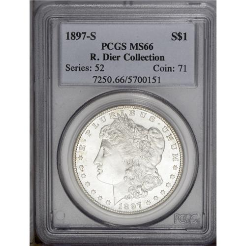 <B>1897-S<img border='0' src='http://www.heritagecoins.com/images/star.gif' width=10 height=10>$1> MS66 PCGS.</B></I> Ex: R. Dier Collection. A suitably struck Gem with booming luster and a hint of gold patina on the cheek and left obverse field. The 1897-S is among the more available later S-mint issues, but it becomes scarce at this challenging level of preservation.<BR><I>From The Michael Casper Collection, Part Three.</B></I>