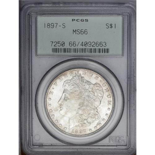 <B>1897-S<img border='0' src='http://www.heritagecoins.com/images/star.gif' width=10 height=10>$1> MS66 PCGS.</B></I> Golden-brown dashes adorn this lustrous and penetratingly struck Premium Gem. Refreshingly undisturbed, and worthy of the highest quality collection. Certified in a green label holder. <BR><BR><B>Important notice:</B> Heritage usually auctions material at the rate of 200-250 lots per hour. On some occasions eBay Live bid software or the Internet may not be able to keep up with the pace of the auction. We recommend placing a realistic absentee bid now as insurance to avoid disappointment. Occasionally the auctioneer may eliminate or reject an eBay Live bid, and the auctioneer may also reopen a lot after the close of the eBay live bidding (usually because we missed an audience bid), and may reject your bid even if it shows you as the winning bidder. By bidding via eBay Live, you agree that Heritage may award the lot to another bidder at its sole discretion under the circumstances described above or any other reasonable circumstances. Since eBay bids are not shown to us until we open the lot on the floor, we treat those bids just like floor bids. In most cases the floor responds before the eBay bid is presented to us, due to Internet lag time, so for consistency we have made it a policy that floor bids are always considered first over tie eBay live bids. Also please note that all Heritage lots purchased through eBay Live carry a 20% Buyer's Premium. Please make sure you read the Terms and Conditions before you bid. This lot is being auctioned in conjunction with a live floor auction by Heritage Galleries & Auctioneers. All final auction and invoice information will be supplied by Heritage Galleries & Auctioneers, and all other information should be considered preliminary. Lot:3718 <BR><BR><B>Winning Notification and Billing:</B> After the FINAL session in this auction is complete, Heritage will send e-mail and snail mail invoices. This process normally takes several days. All final auction and invoice information will be supplied by Heritage Galleries & Auctioneers, and all other information should be considered preliminary. <BR><BR>This auction will be conducted on a live auction floor and over the Internet through eBay Live. If you choose to place an absentee bid, please take a moment to <font color='#0000ff'><u><a href='http://pages.ebay.com/liveauctions/help/before/laabsentee.html'>learn how eBay Live absentee bidding works</a></u></font><font color='#000000'>