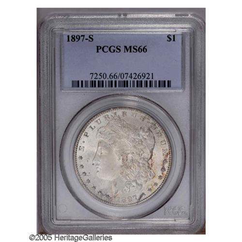 <B>1897-S<S$1> MS66 PCGS.</B></I> Orange and plum colors are particularly prominent along the reverse periphery. This lustrous premium Gem has an exceptionally smooth obverse, and the reverse shows only minor contact on the centers.
