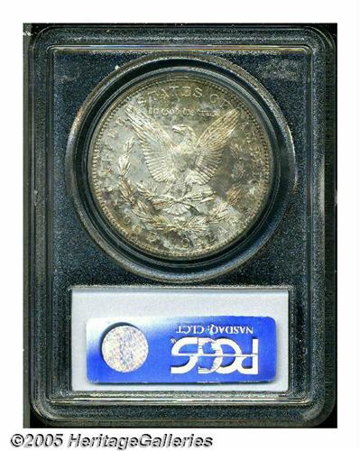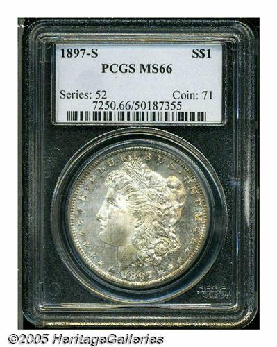 <B>1897-S<S$1> MS66 PCGS.</B></I> The design features are sharply struck, and the lustrous surfaces display splotches of gold and russet color. There are no mentionable marks to report. PCGS grades only 22 pieces finer (3/05).