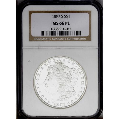 <B>1897-S<img border='0' src='http://www.heritagecoins.com/images/star.gif' width=10 height=10>$1> MS66 Prooflike NGC.</B></I> Though the 1897-S is not particularly scarce with prooflike fields (as about 20% of the certified population is so classified), when they are combined with a high grade such as MS66, they become a more challenging issue. And when they are sharply struck, such as the present coin, they are even more desirable. Liberty's hair, including that over the ear, and the eagle's breast feathers, are nicely defined. The surfaces are essentially untoned, and reveal just a few luster grazes that prevent an even higher grade. Census: 13 in 66, 2 finer (3/06). <BR><BR><B>Important notice:</B> Heritage usually auctions material at the rate of 200-250 lots per hour. On some occasions eBay Live bid software or the Internet may not be able to keep up with the pace of the auction. We recommend placing a realistic absentee bid now as insurance to avoid disappointment. Occasionally the auctioneer may eliminate or reject an eBay Live bid, and the auctioneer may also reopen a lot after the close of the eBay live bidding (usually because we missed an audience bid), and may reject your bid even if it shows you as the winning bidder. By bidding via eBay Live, you agree that Heritage may award the lot to another bidder at its sole discretion under the circumstances described above or any other reasonable circumstances. Since eBay bids are not shown to us until we open the lot on the floor, we treat those bids just like floor bids. In most cases the floor responds before the eBay bid is presented to us, due to Internet lag time, so for consistency we have made it a policy that floor bids are always considered first over tie eBay live bids. Also please note that all Heritage lots purchased through eBay Live carry a 20% Buyer's Premium. Please make sure you read the Terms and Conditions before you bid. This lot is being auctioned in conjunction with a live floor auction by Heritage Galleries & Auctioneers. All final auction and invoice information will be supplied by Heritage Galleries & Auctioneers, and all other information should be considered preliminary. Lot:3719 <BR><BR><B>Winning Notification and Billing:</B> After the FINAL session in this auction is complete, Heritage will send e-mail and snail mail invoices. This process normally takes several days. All final auction and invoice information will be supplied by Heritage Galleries & Auctioneers, and all other information should be considered preliminary. <BR><BR>This auction will be conducted on a live auction floor and over the Internet through eBay Live. If you choose to place an absentee bid, please take a moment to <font color='#0000ff'><u><a href='http://pages.ebay.com/liveauctions/help/before/laabsentee.html'>learn how eBay Live absentee bidding works</a></u></font><font color='#000000'>