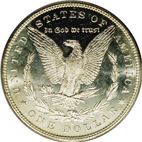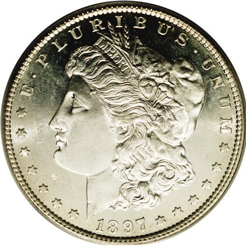 <B>1897-S<img border='0' src='http://www.heritagecoins.com/images/star.gif' width=10 height=10>$1> MS66 Prooflike PCGS.</B></I> Untoned with a bright sheen, the surfaces are pleasingly reflective in the fields with light mint frosting over the devices. The latter are also boldly impressed, and there are no mentionable abrasions save for a few shallow grazes on the reverse eagle. A planchet void in the obverse field below Liberty's chin is noted. Population: 21 in 66 Prooflike, only two are finer with this finish (2/06).