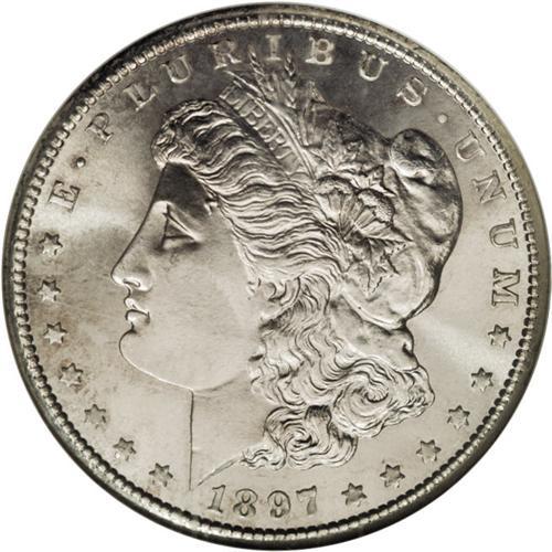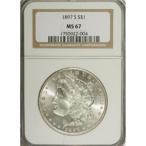 <B>1897-S S$1 MS67 NGC.</B></I> Although not a common date like the San Francisco Mint coins of the early 1880s, this date is generally available without much difficulty in grades through MS65. Even those at the MS66 grade level can be found with a little patience. However, Superb Gem examples like this lustrous piece are not seen with any regularity. Both sides of this remarkable beauty have brilliant silver surfaces and satiny luster with no evidence of toning. Census: 11 in 67, 0 finer (4/07).<BR><BR><b>Shipping:</b> Coins & Currency (<a target="_blank" href="http://www.heritageauctions.com/common/shipping.php">view shipping information</a>)
